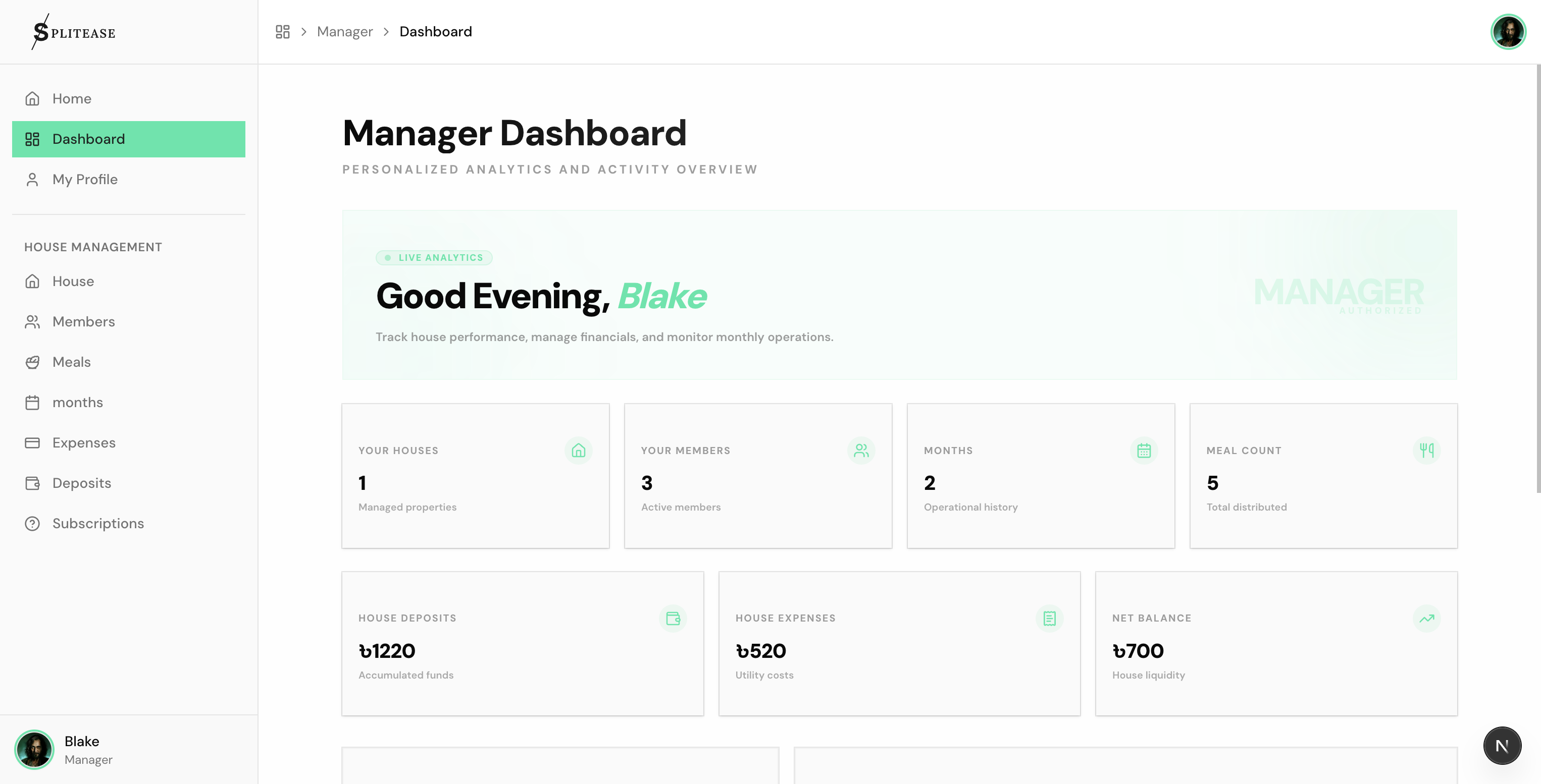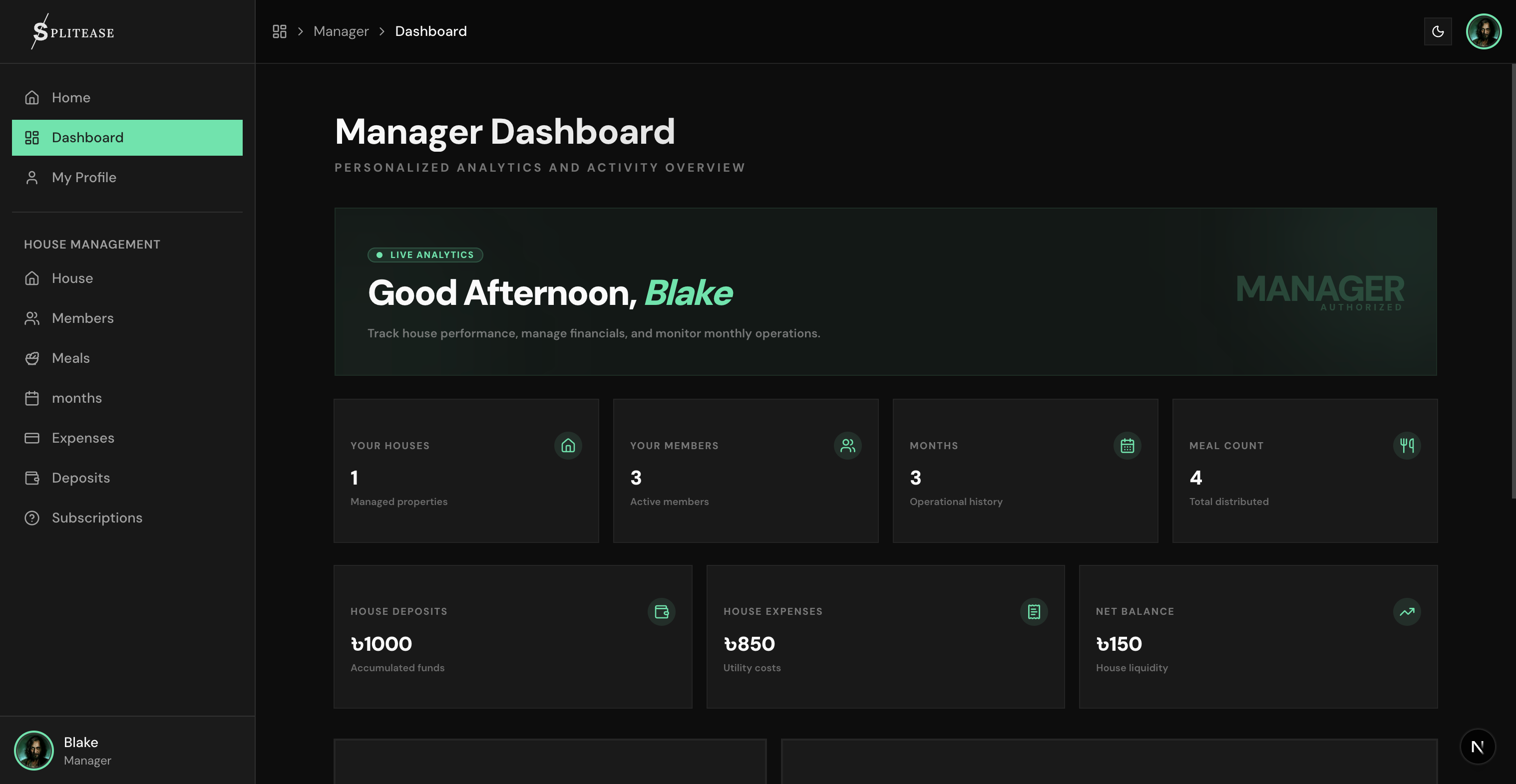 SplitEase helps managers and members track meals, deposits, expenses, and monthly settlements from one clean dashboard.